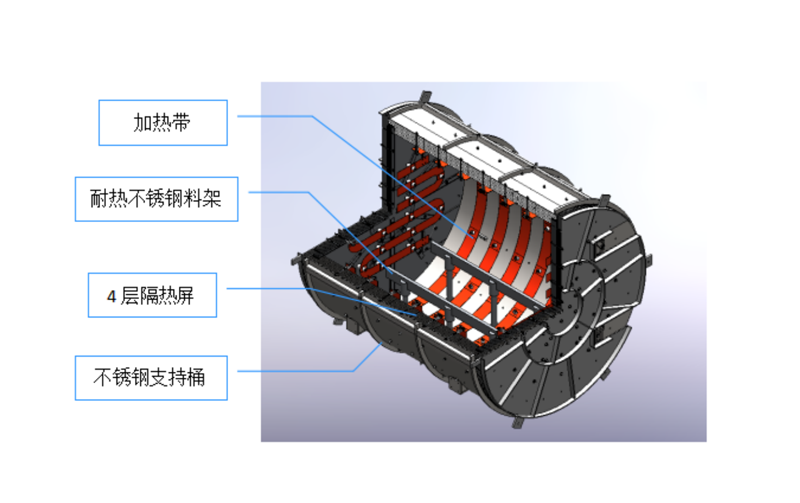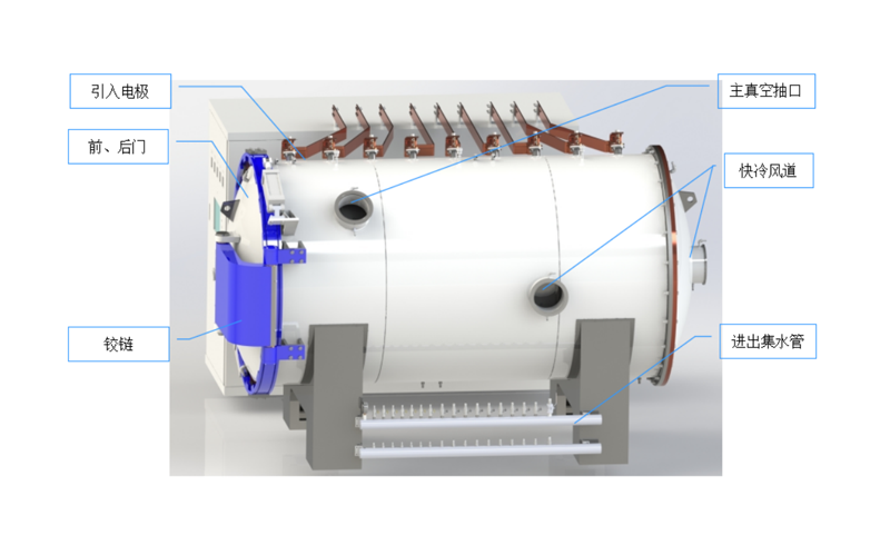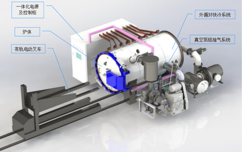 設備主要組成:爐體、内部溫場、工件料架機構、真空系統、測量控制系統、加熱電源、檢測控制部分、水路、氣路、料架、專用進出料車等部分組成。