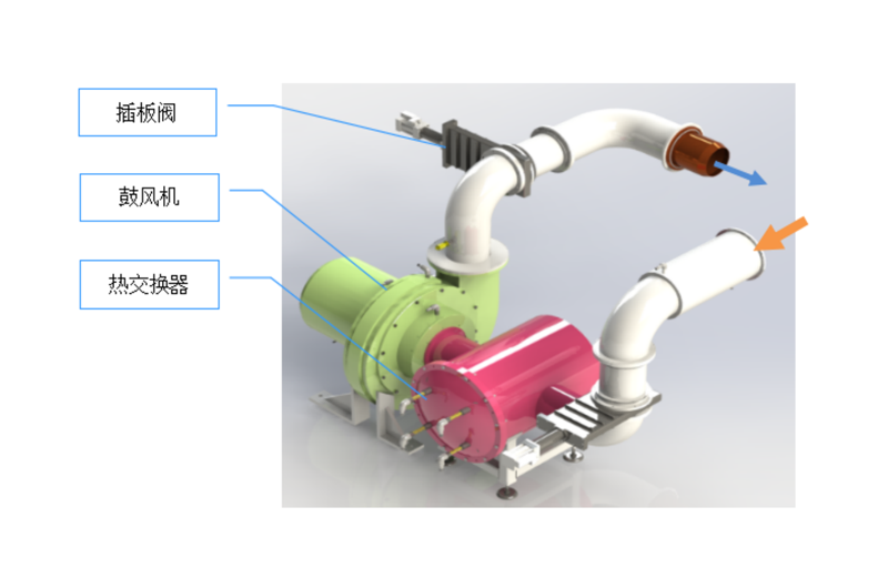 外部快速冷卻系統由冷卻管道,高真空插闆閥,真空鼓風機和熱交換器組成。在燒結或熱處理工藝完成後,在冷卻到650℃及以下時,啓動快速冷卻系統。利用風機,帶動熱風循環,通過熱交換器冷卻水快速把熱量帶走,達到快速冷卻效果。